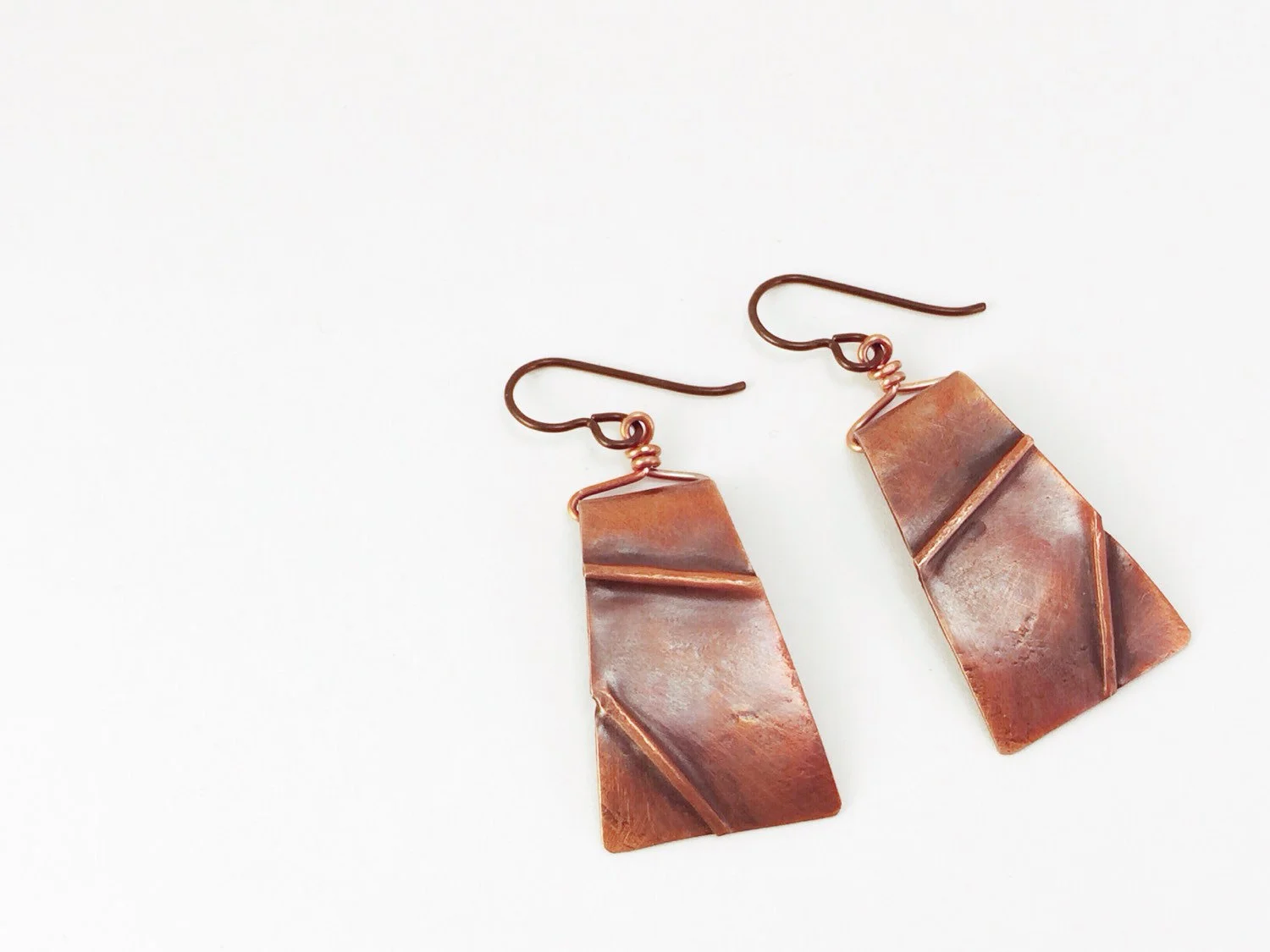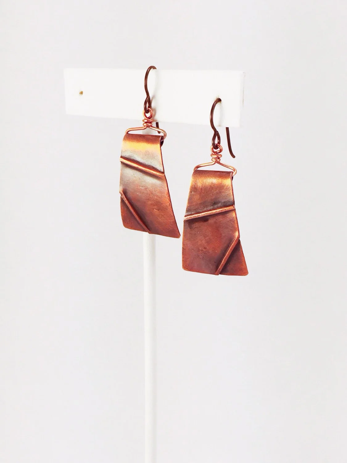 These copper earrings are individually hammered and heated multiple times to achieve the distinct ridges and valleys. A series of coloring techniques brings out the textures and warm copper tones. Each pair is sealed with a jewelers' wax to protect the finish with a satin sheen.