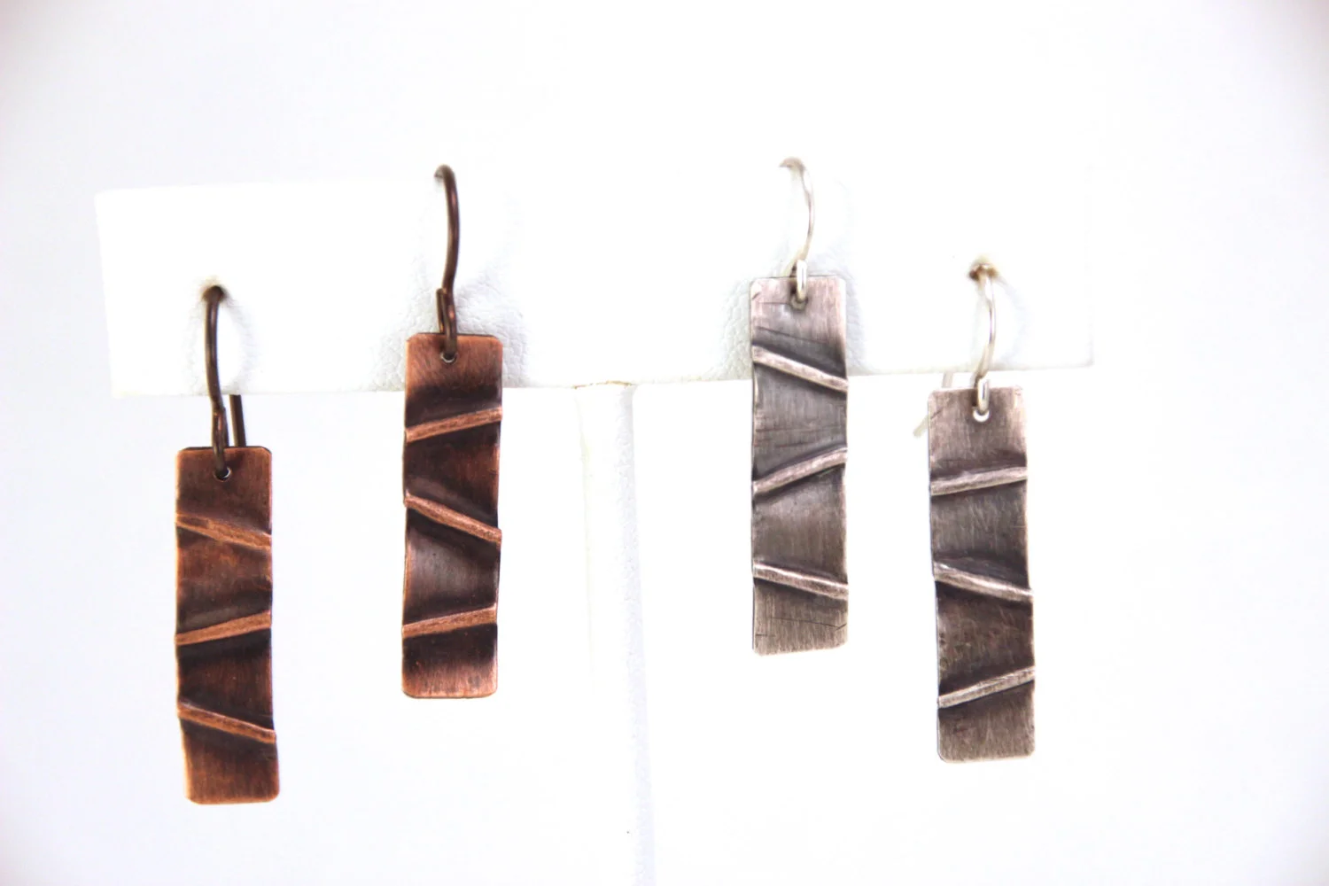 These sterling or copper earrings are individually hammered and heated multiple times to achieve the distinct ridges and valleys. A series of coloring techniques brings out the textures and natural metal tones. Each piece is sealed to protect the finish.